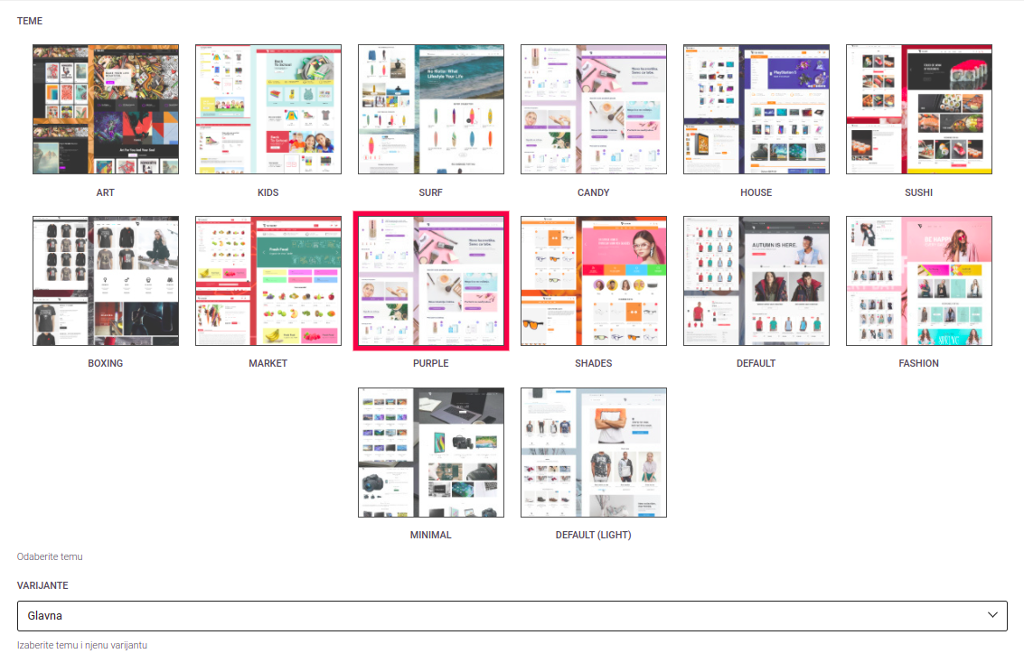 TAU Commerce dolazi sa mnogo unapred instaliranih tema. Da biste primenili druge teme, potrebno je da nakon odabira nove, sačuvate podešavanja. Promena tema neće uticati na Vaše podatke. Mnoge teme imaju više varijacija boja od kojih možete odabrati svoj izgled. Ukoliko Vam je potrebna prilagođena tema, ne ustručavajte se da nas kontaktirate putem support@taucommerce.com i biće nam zadovoljstvo da vam pružimo temu koja odgovara vašim potrebama.