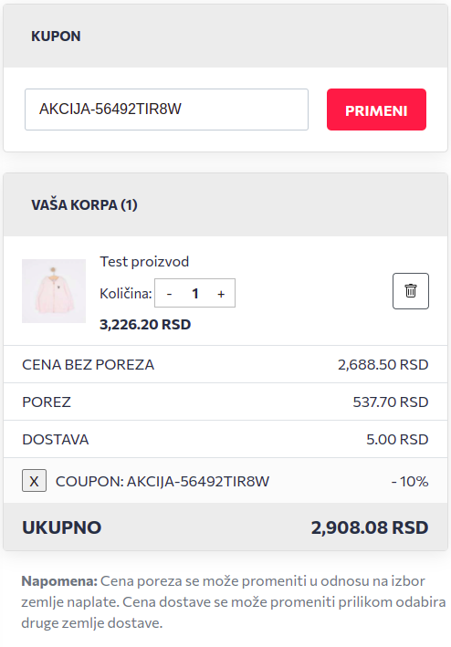 Napomena: Kada završite sa kreiranjem kupona, potrebno je da kupone omogućite u delu Podešavanja -> Osnovno. Kupac na kasi unosi naziv kupona, gde unosi svoje podatke i informacije o dostavi/plaćanju. Kupon se odmah primenjuje uz prikaz krajnje cene. (slika)