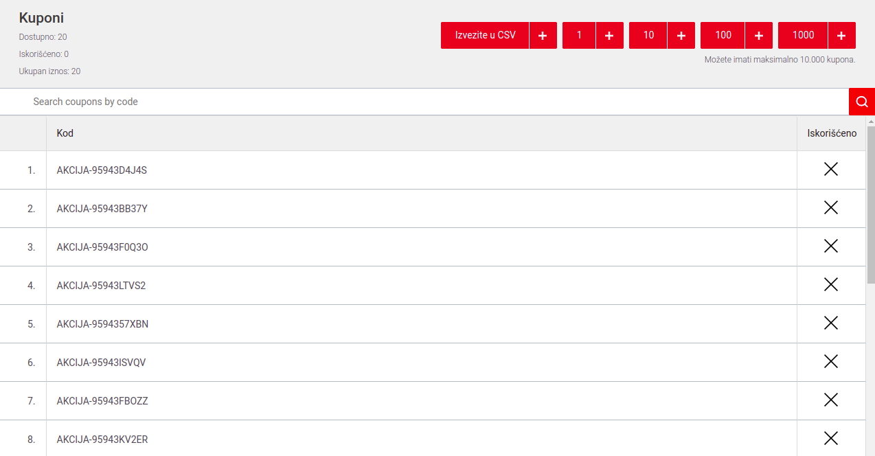 Jednokratni su liste kupona koji se mogu iskoristiti samo jednom. Svaka grupa treba da ima definisan prefiks jer će vam pomoći da razlikujete kupone jedan od drugog. Prefiks se dodaje svakom kuponu u formatu “PREFIKS-KOD”. Potrebno je da upišete broj kupona koji želite. Nakon unosa svih neophodnih podataka, potrebno je potvrdite generisanjem kupona (klikom na "generiši") nakon čega će biti prikazan celokupni spisak svih kupona (slika). Dalje možete proslediti Vašim potencijalnim klijentima za korišćenje.