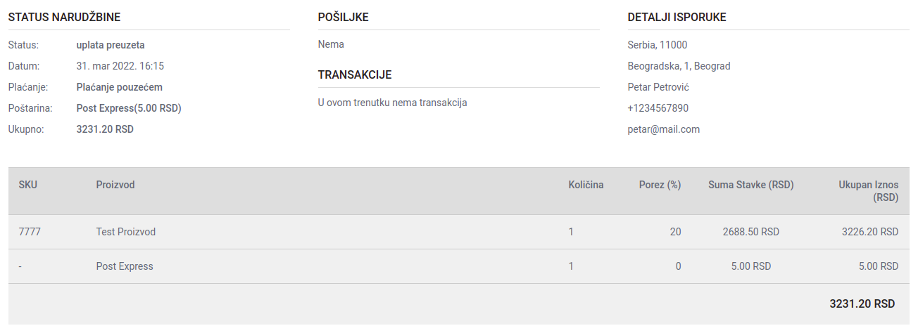 Ispod statusa imate prikaz svih detalja Vašeg kupca i proizvoda koje želi da kupi i po kojoj ceni. Trenutno nemate mogućnost da menjate narudžbinu kupca, u smislu proizvoda ili količine koja je poručena. Prikaz navedenih detalja nalazi se u nastavku.