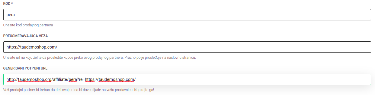 Za početak unosite ime i email Vašeg partnera. Bitno polje je KOD i unosite ga ispod osnovnih podataka, koji ne mora nužno biti broj, već možete uneti i naziv. Sledeće polje je link na Vašem sajtu, na koji želite da budu preusmereni potencijalni kupci.
