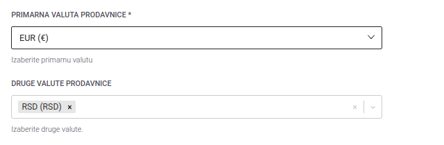 Vaša online prodavnica podržava više valuta. Primarna valuta je ona koja će se inicijalno prikazivati kada kupci posete Vašu prodavnicu. Možete lako da dodate novu valutu klikom na Podešavanja -> Valute. Prilikom dodavanja nove valute preporučuje se da popunite tabelu konverzije sa desne strane.
