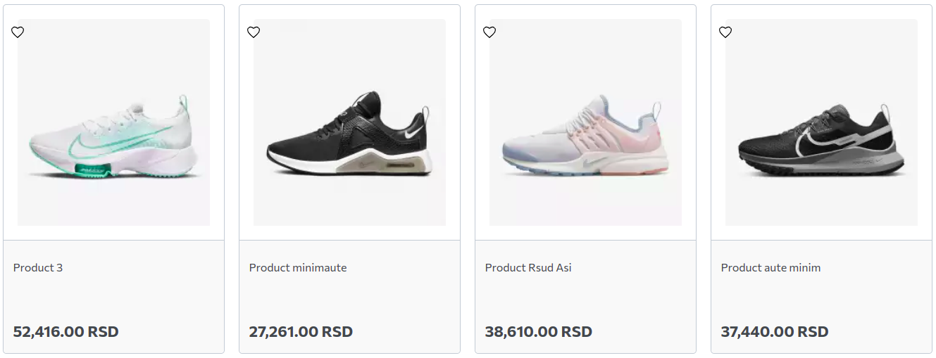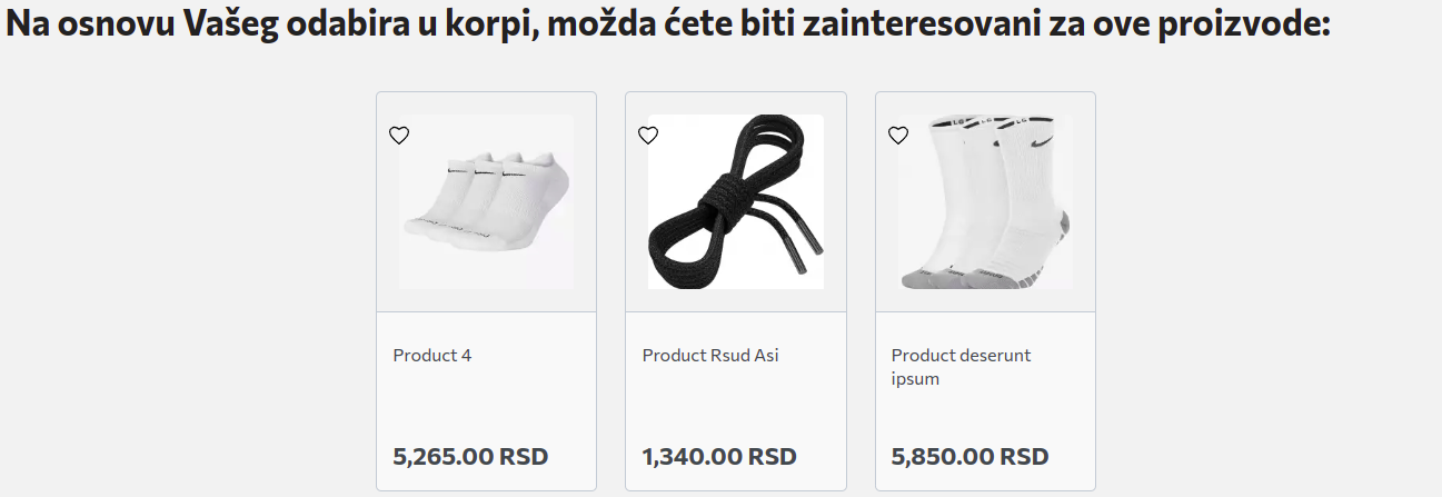 Ako kupac ima patike u korpi, može imati preporučene proizvode u korpi kao na primeru u nastavku.