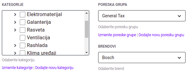 Proizvodi mogu da pripadaju određenoj kategoriji ili nekoliko kategorija/podkategorija. U listi sa desne strane potrebno je da obeležite one kojoj pripada. Proizvodi takođe mogu pripadati određenom brendu što će rezultirati prikazivanjem tog proizvoda na stranici brenda. Jednostavno izaberite brend iz liste koja će prikazati sve prethodno sačuvane brendove. Navedene opcije znatno olakšavaju pretragu od strane kupca. Birate nakon toga koji porez će biti obračunat na Vaš proizvod. (slika)