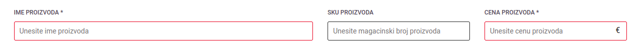 Ime i cena proizvoda su neophodne informacije, da bi Vaš proizvod bio uspešno sačuvan. Pored toga, sugerišemo da unesete SKU (magacinski broj proizvoda). Navedene podatke unosite na samom vrhu. (slika)