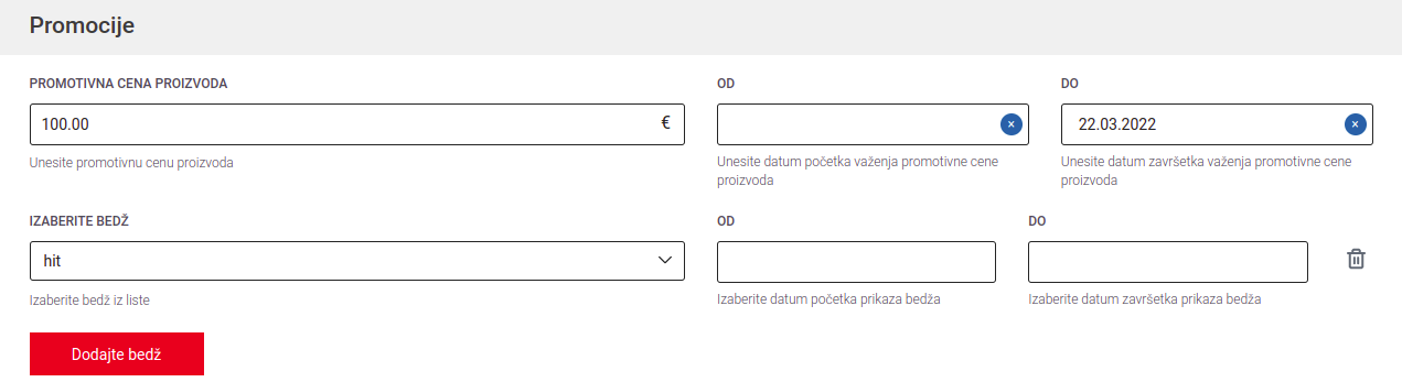 Pored promotivne cene, u ovom odeljku birate bedž koji će se prikazati na željenom proizvodu. Bedževe kreirate prethodno i u padajućem meniju birate koji će biti zalepljen za konkretan proizvod. Jedna reč koja će privući Vaše kupce.