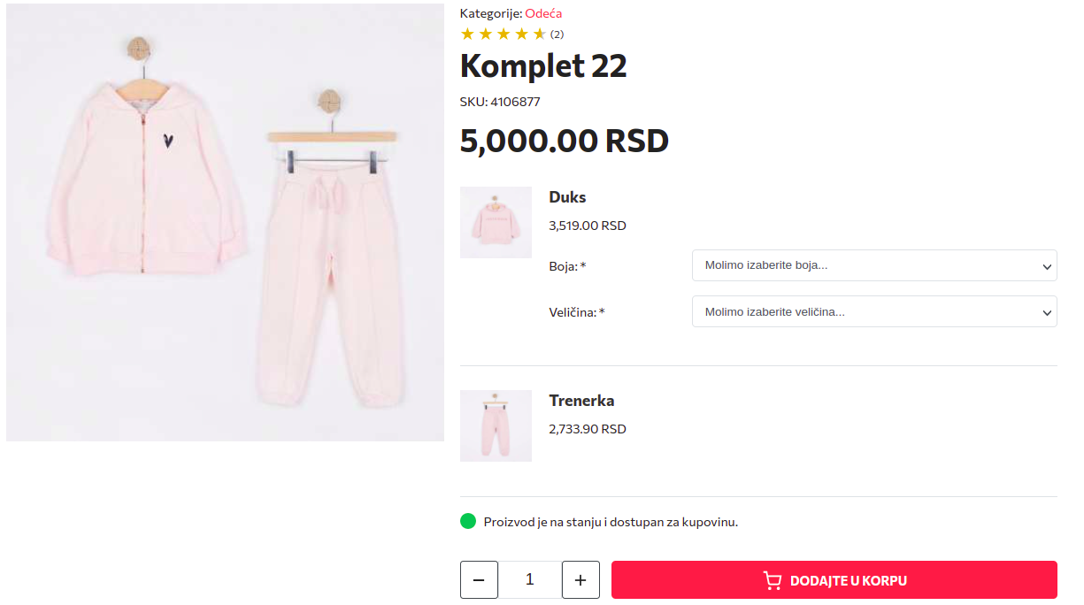Grupisani proizvod: Ovaj proizvod se lako može opisati kao skup proizvoda. Dobar primer bi bili džemper i šešir. Proizvod može da sadrži više proizvoda - jednostavnih ili podesivih. Navedena vrsta proizvoda se uglavnom koristi za promocije poput „Kupite farmerke i džemper i uštedite 20%“. Važno obaveštenje: grupisani proizvodi ne mogu da sadrže više istih proizvoda u ovom trenutku iako je ovo nadolazeća funkcija. Ovaj proizvod nasleđuje sve atribute od svojih podređenih proizvoda i zahvaljujući ovoj funkciji, može pomoći vašim klijentima da ga lakše pronađu na listi koristeći filtere.
