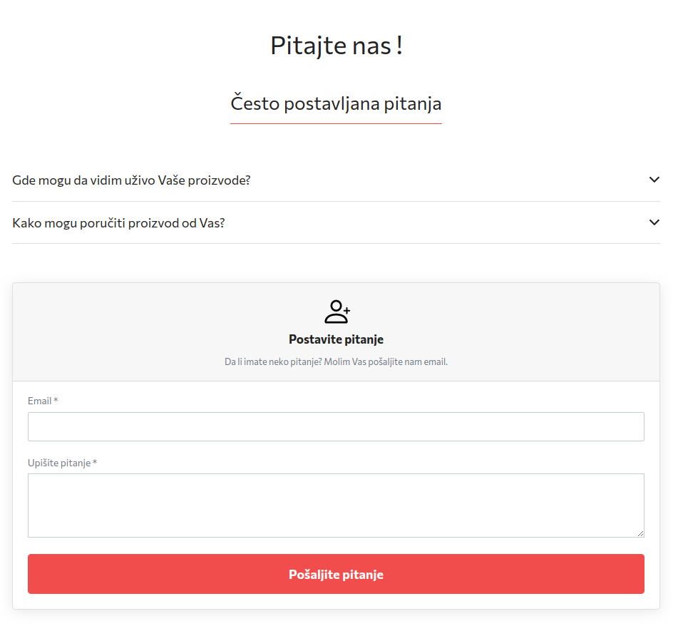 Može prikazati samo neka pitanja i odgovore ili može prikazati sva pitanja i odgovore. Podstičemo Vas da napravite jednu stranicu koja će se zvati PITANJA i koja će prikazati sva pitanja i odgovore koje smatrate važnim za Vašu prodavnicu. U nastavku se nalazi primer.