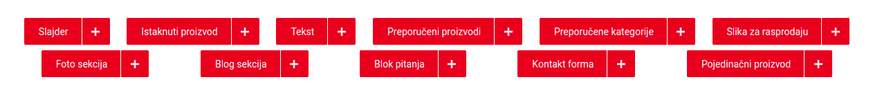 Naslovna stranica se kreira uz pomoć blokova. Blok je element „građevinskog bloka“ stranice. Na primer, možete imati slajder, istaknute proizvode, istaknute kategorije, tekst, odeljak za fotografije, rezime bloga... Svaki od blokova možete nekoliko puta koristiti na stranici, sa različitim slikama ili proizvodima. U ponudi su: